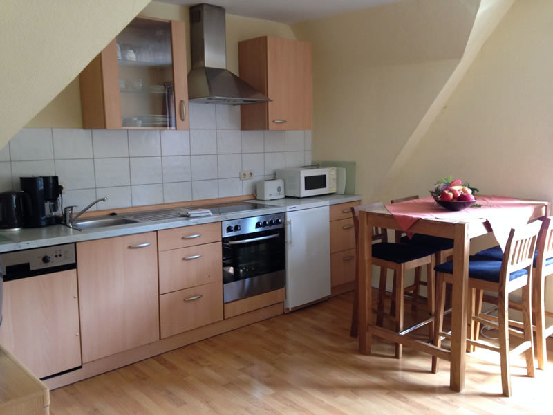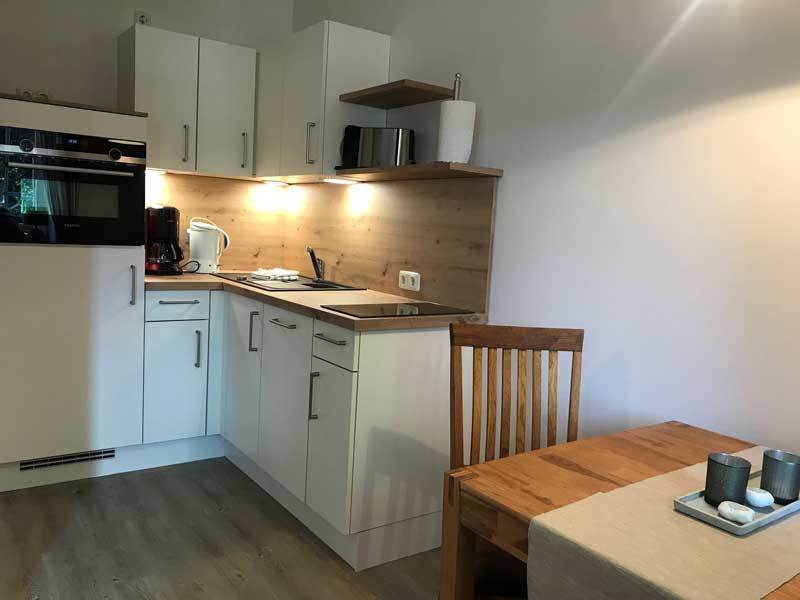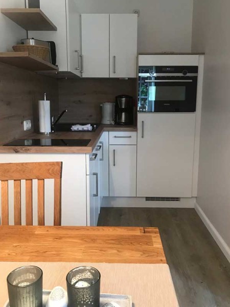 - komplett ausgestattete Küchenzeile inkl. Mikrowelle, Kochfeld, Kühlschrank inkl. Gefrierfach, Kaffeemaschine, Toaster und Wasserkocher
