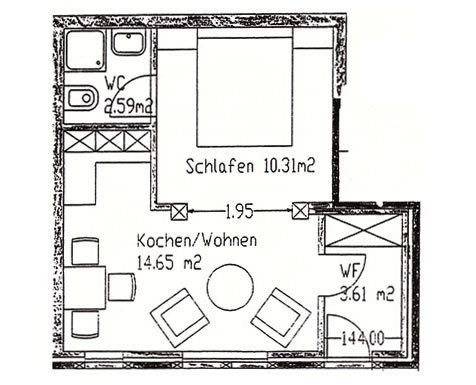 Die Apartments sind Wohn-/Schlafkombinationen mit Einzel- bzw. Doppelbetten, eigenem Bad mit Dusche und WC sowie zusätzlicher Küchenzeile, die in den Wohnraum integriert ist.